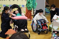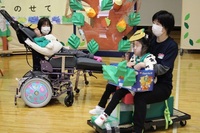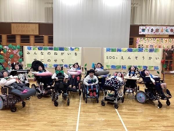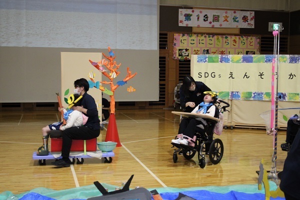 今年の発表は『みんなのねがいを音にのせて~SDGsえんそうかい~』でした。事前学習で学んだSDGsをテーマに、海と森で集めた廃材から楽器を作って演奏会をしました。図工では、海のブルーと森のグリーンをベースにした絵の具を使った「たらし込みアート」で題字の背景を作成しました。