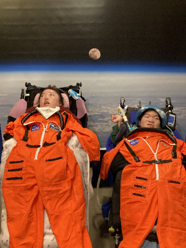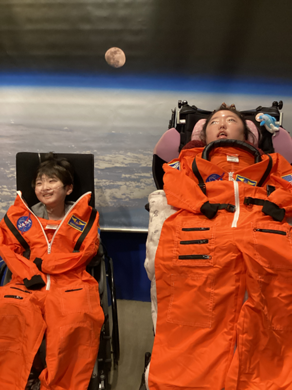 はじめに、宇宙飛行士のユニフォームを着てみんなで写真撮影をしました。背景は、宇宙と月で、まるでみんなが宇宙にいるような写真が撮れました。ウーパールーパーやメダカ、クワガタなども観ることができ、生徒たちは興味津々でした。