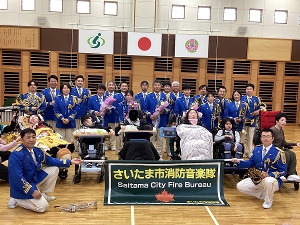 「ヒイラギ飾ろう」や「We Wish You a Merry Christmas」、「きよしこのよる」、「恋人たちのクリスマス」等のクリスマスソングメドレーでは、曲に合わせてさくら草の児童、生徒が準備をした楽器で、消防隊のみなさんと一緒に合奏しました。