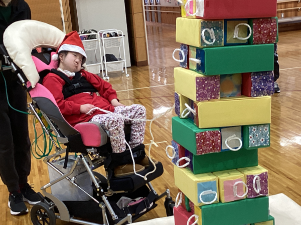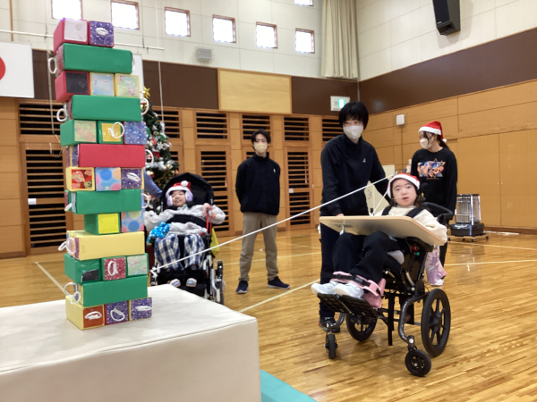 その後、みんなで楽しく「あわてんぼうのサンタクロース」を歌ったり、ジェンガをやったりし、リースを飾ったクリスマスツリーをバックに写真を撮りました。